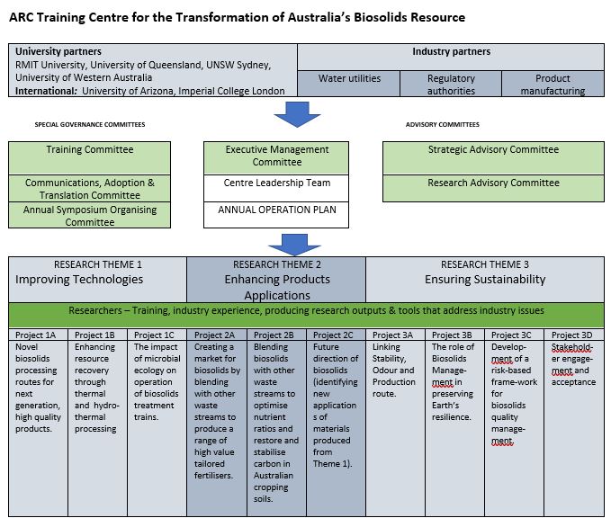 A Centre governance and operations team will ensure all objectives of the Centre are met within the proposed budget and timeframe, as well as delivering effective outcomes. It covers the management of both training and research components and their interactions, as well as communications. The structure laid out will enable meaningful engagement between investigators, industry, industrial growth centres and government agencies. These groups will be brought together through the following: