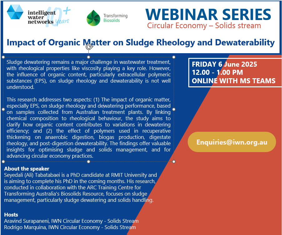 Webinar Series - Impact of Organic Matter on Sludge Rheology and Dewaterability. Presenter: Seyedali (Ali) Tabatabaei RMIT